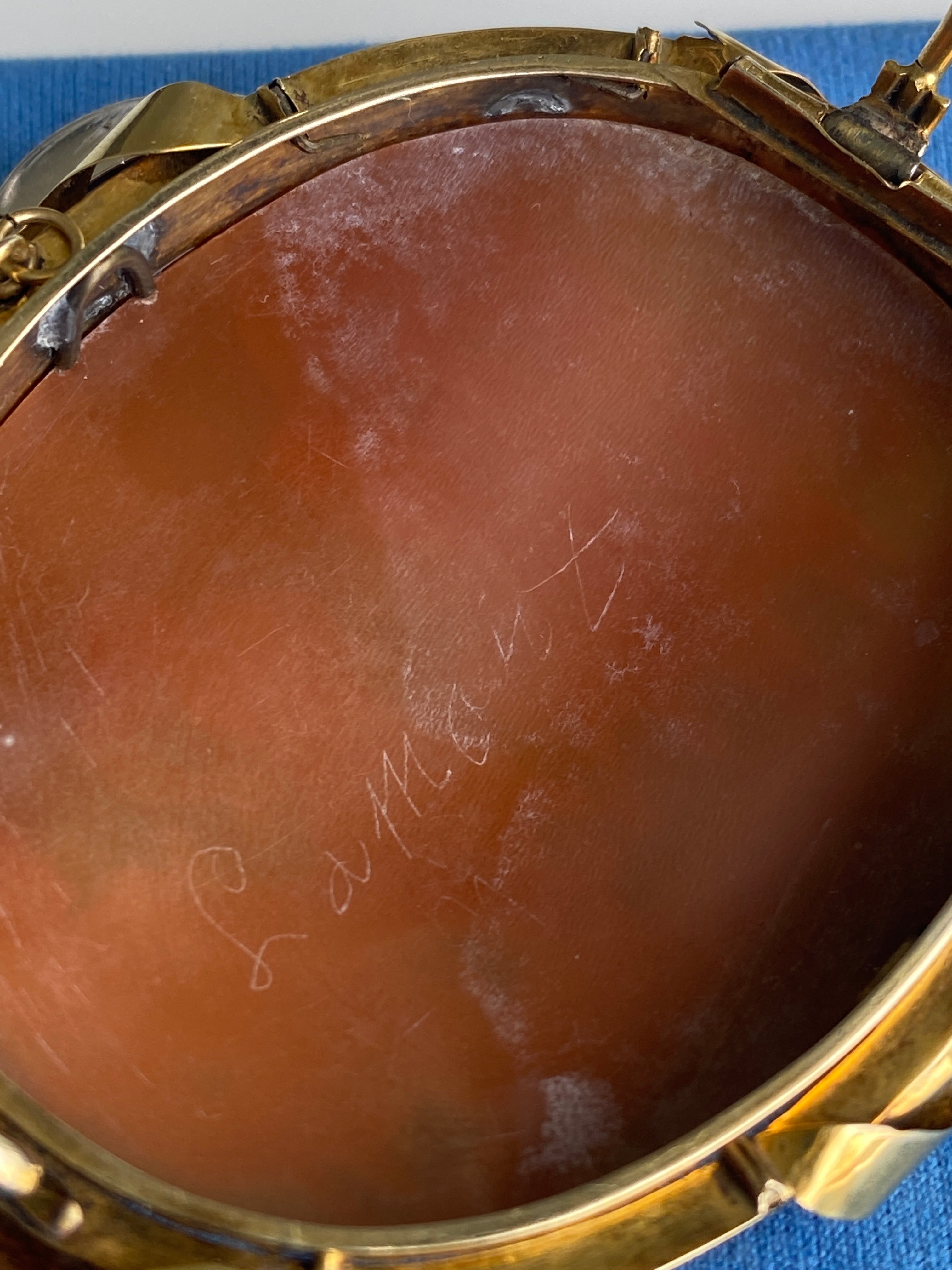 Condition: Cameo not chipped or cracked. Some damage to frame including lead solder to rear of brooch.